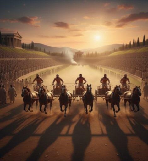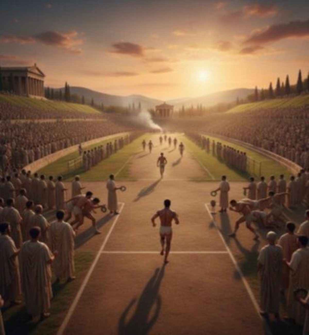 Imaginez une poussière dorée s’élevant de la piste, l’odeur de l’huile d’olive dont les athlètes s’enduisent le corps, et une foule immense campant sous les oliviers.